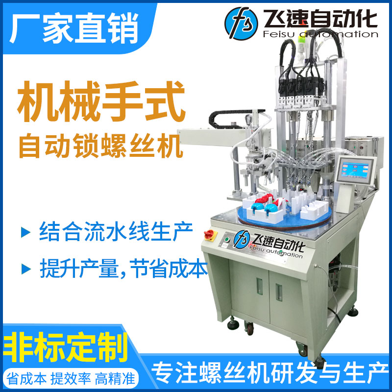 轉(zhuǎn)盤機械手式擰螺絲機優(yōu)點: 省人工,流水線專用,配置機械手和轉(zhuǎn)盤,實現(xiàn)供料、檢測、鎖付、取放產(chǎn)品同步作業(yè),并由設(shè)備自動完成,節(jié)省大量人工;